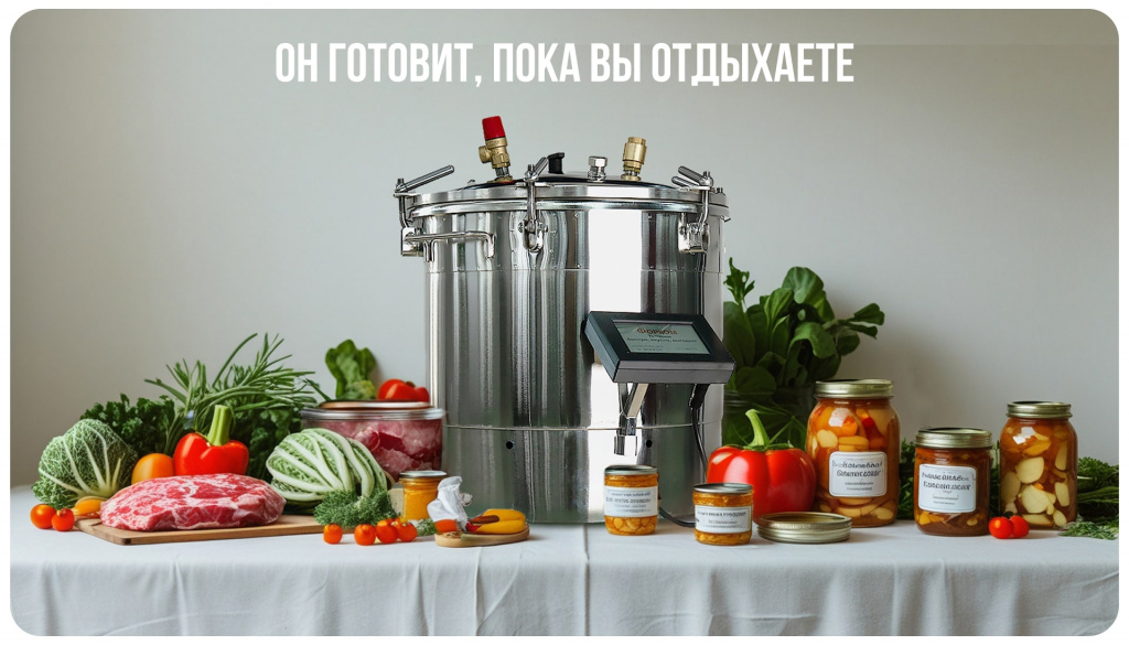 Изготовлен из нержавеющей стали, удобен и безопасен. Можно загрузить наполненную тару, установить программу для мяса, птицы, рыбы, ягод или плодов и заниматься другими делами. Он не занимает плиту, его можно установить на любой ровной поверхности. ЭБУ контролирует давление, температуру, поэтому аварийные ситуации исключены. Аппарат сам сливает воду после завершения цикла, чтобы можно было легко достать содержимое и не переваривать консервы.