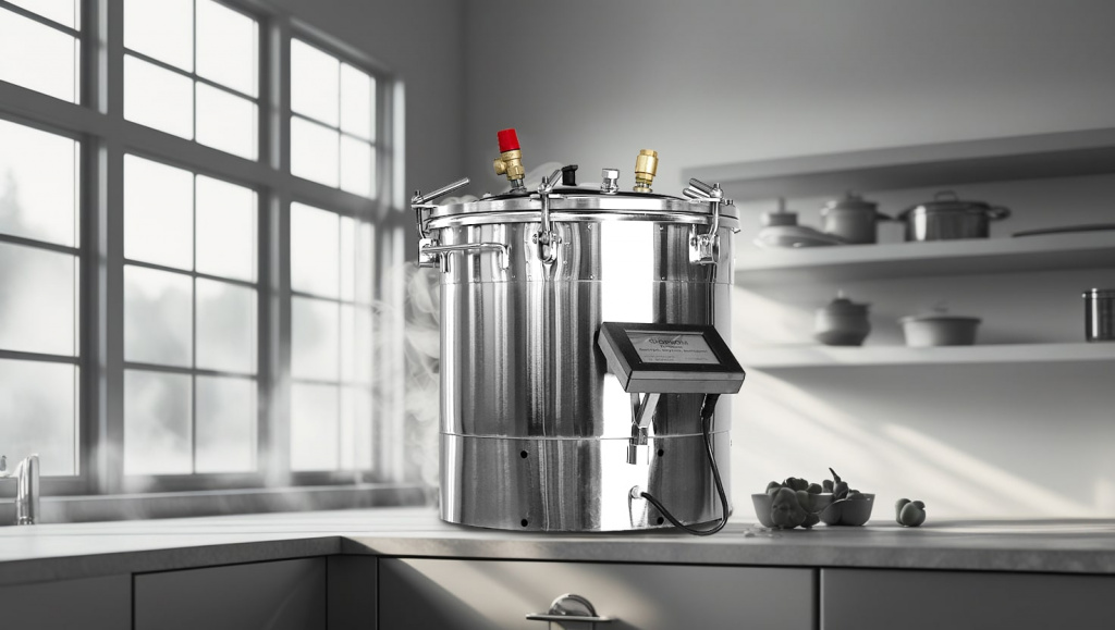 Электрический автоклав из пищевой нержавеющей стали AISI 304 полностью автоматизирует процесс стерилизации. Четыре сенсорных режима — «Мясо», «Птица», «Рыба», «Компот» — а также возможность сохранения до 10 собственных программ.